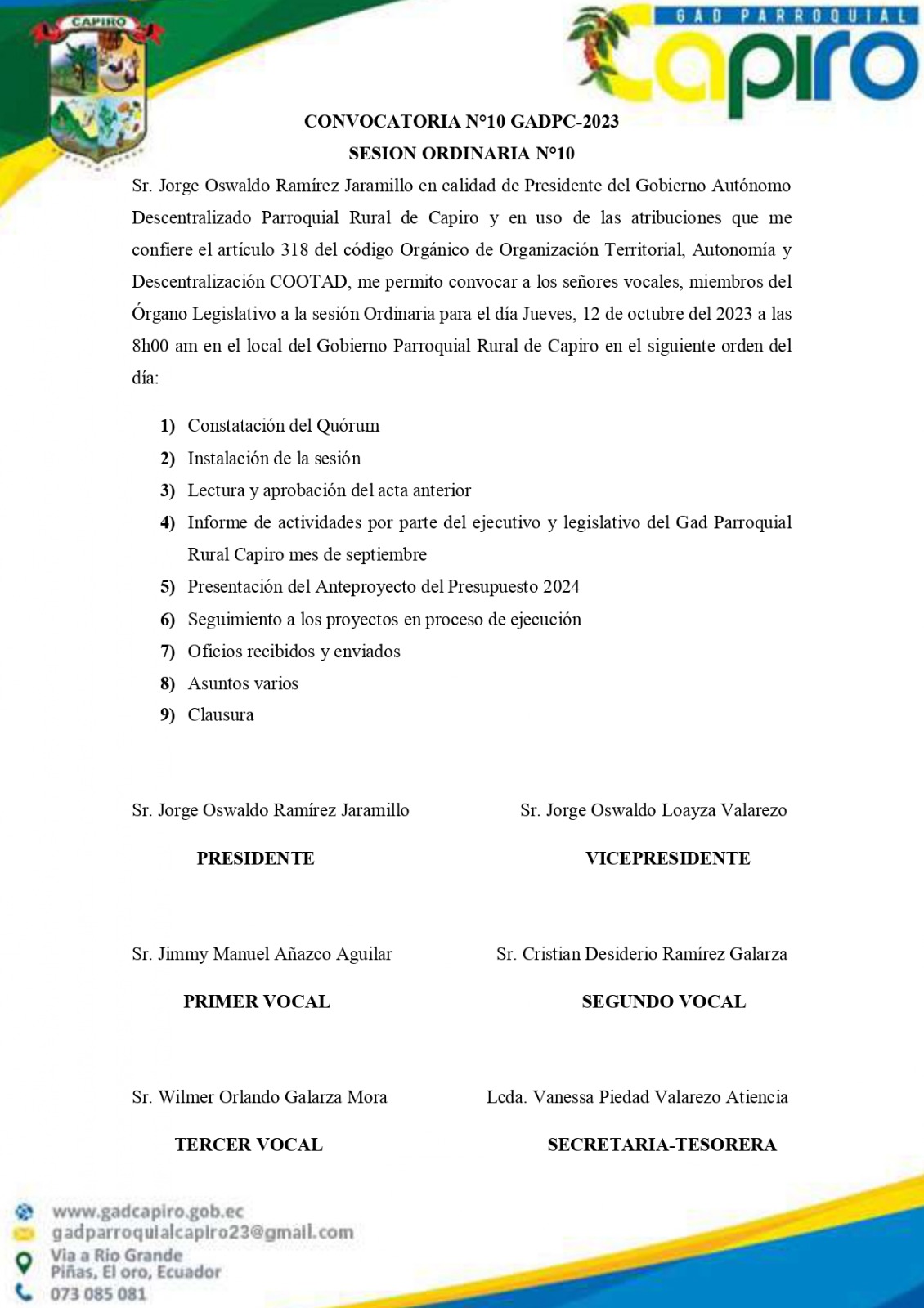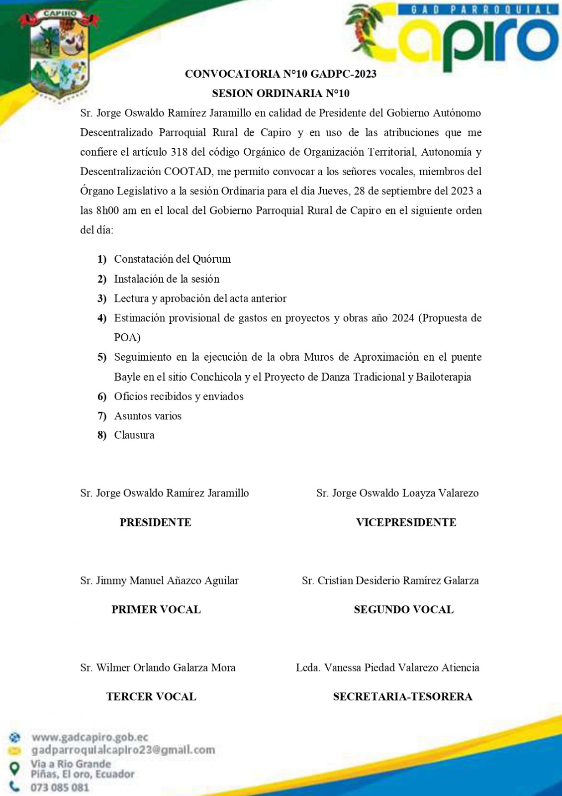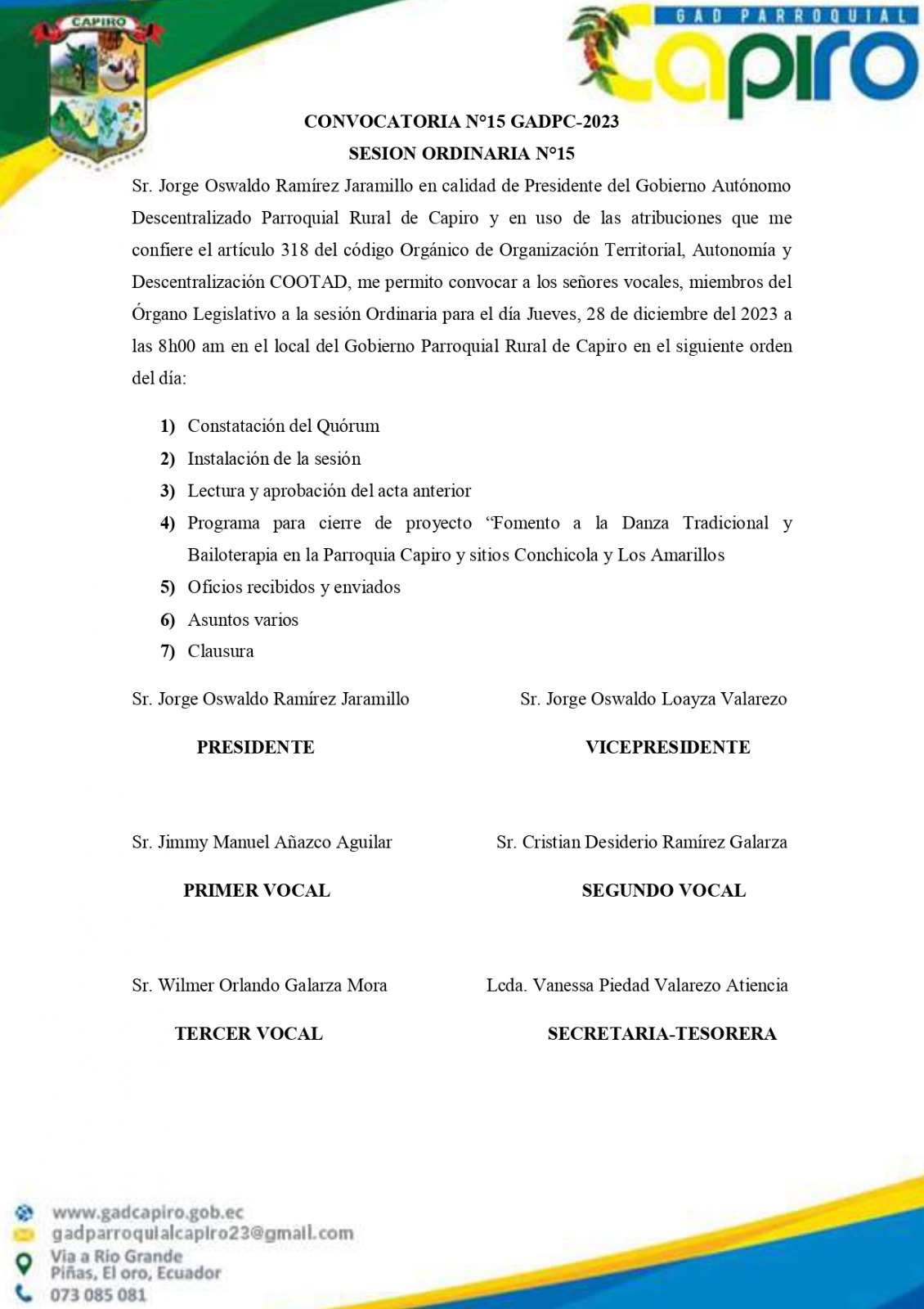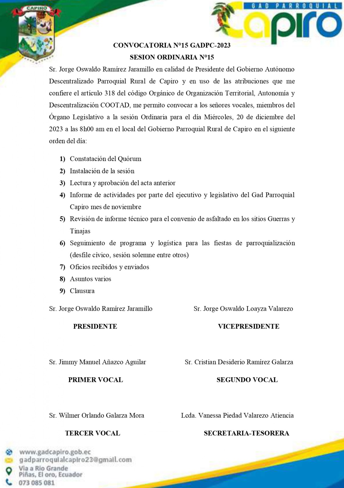 Publicado el Viernes, 25 Agosto 2023 15:28 | Escrito por Super User | | | Visitas: 1549 CONVOCATORIA 2023 SESIÒN ORDINARIA Nº08. SESIÒN ORDINARIA Nº10 - MIERCOLES 28 DE SEPTIEMBRE 2023. SESIÒN ORDINARIA Nº10 - JUEVES 12 DE OCTUBRE 2023. SESIÒN ORDINARIA Nº15 - MIERCOLES 20 DE DICIEMBRE 2023. SESION ORDINARIA Nº15 - JUEVES 28 DE DICIEMBRE 2023. CONVOCATORIA - JUEVES 19 DE OCTUBRE 2023.